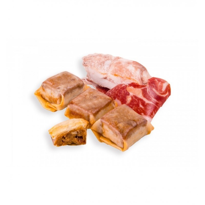 RAVIOLI CRUJIENTE DE SECRETO CON CEBOLLA CONFITADA Y JAMON 25 GR./UNIDAD